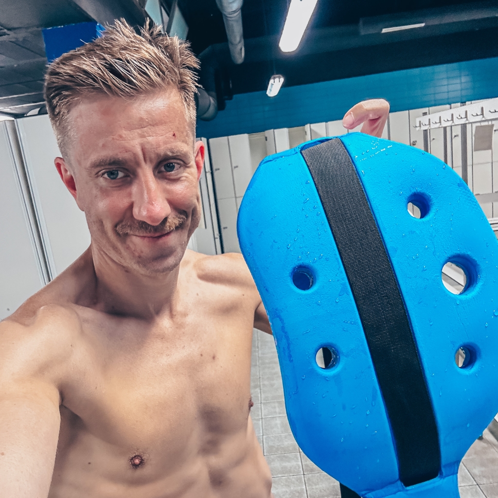 It’s best to dress as you would for the pool. I tried wearing running shorts, but I ended up with terrible chafing [smile]. A swimsuit works best, along with a swim cap if required, a buoyancy belt, and… that’s it! Nothing else is needed. Just remember, your head has to stay above the water. I use a belt that provides buoyancy up to 105 kg (for my weight of just under 70 kg).