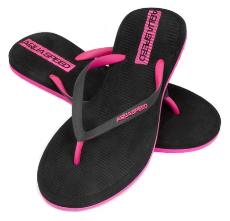 Damskie japonki Genoa od Aquaspeed to doskonały wybór na basen i na wakacje nad morzem. Kontrastowe kolory nadają klapkom tym ciekawy wygląd. Wygodna wewnętrzna podeszwa i pasek gwarantują komfort użytkowania a zewnętrzna, odporna na ścieranie podeszwa z trakcją pomaga uniknąć poślizgnięcia się.